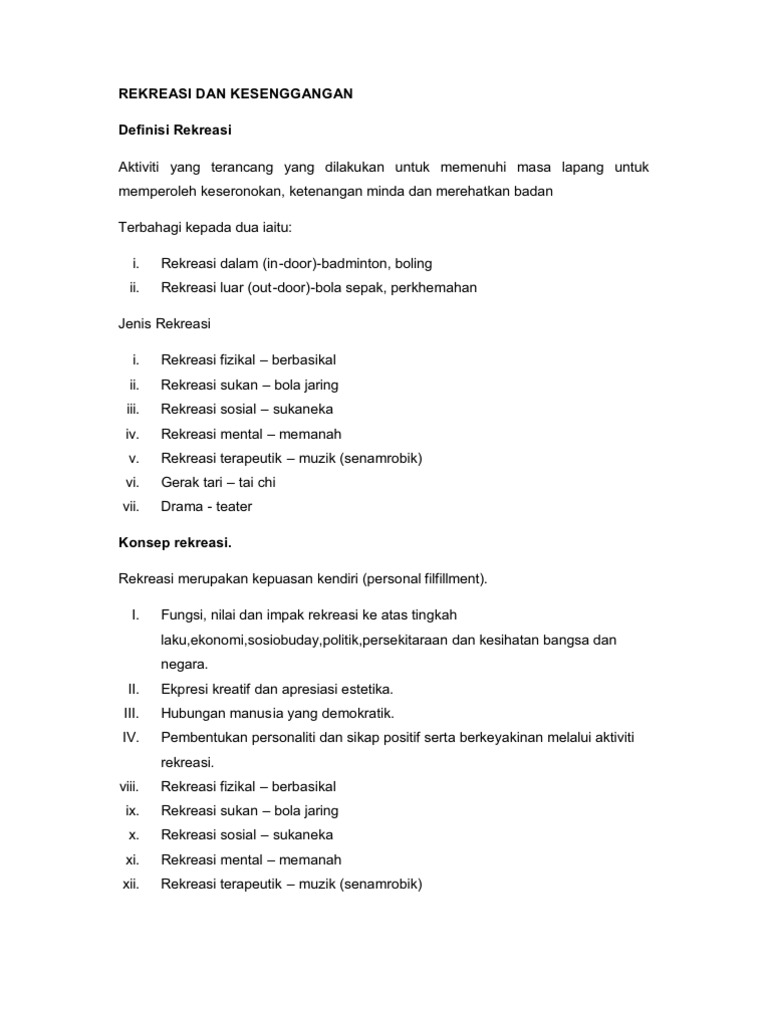 Secara umumnya rekreasi adalah aktiviti yang dilakukan oleh seseorang selain pekerjaan. Vi 293 Konsep Pengurusan Fasiliti 101. Selain itu aktiviti-aktiviti rekreasi mampu menjadi medium perhubungan silaturrahim antara keluarga dan rakan-rakan.
